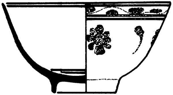 | 5c | beschildering binnenzijde: lijnen en op bodem bloem, buitenzijde: bloemen en langs rand fries. onderglazuur blauw |