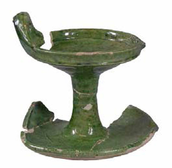 | 4b | olielamp met twee schalen en stam, 1 worstoor, lekschaal afgeplat, geknikte rand |