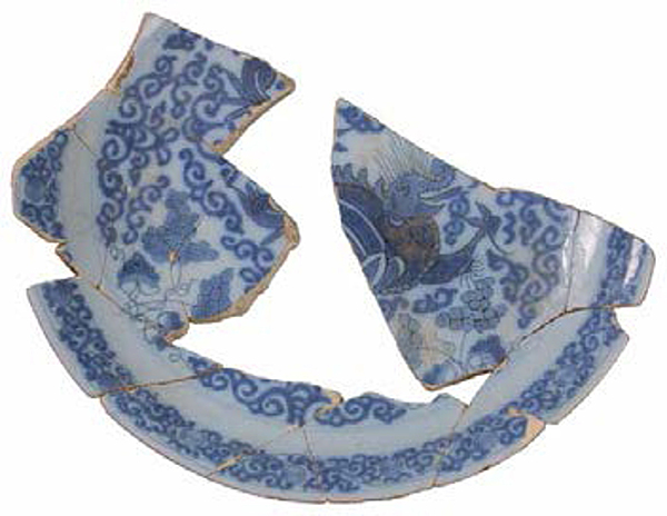 | 5c decoratie | blauwe beschildering: fabeldier en druiventrossen blauw |