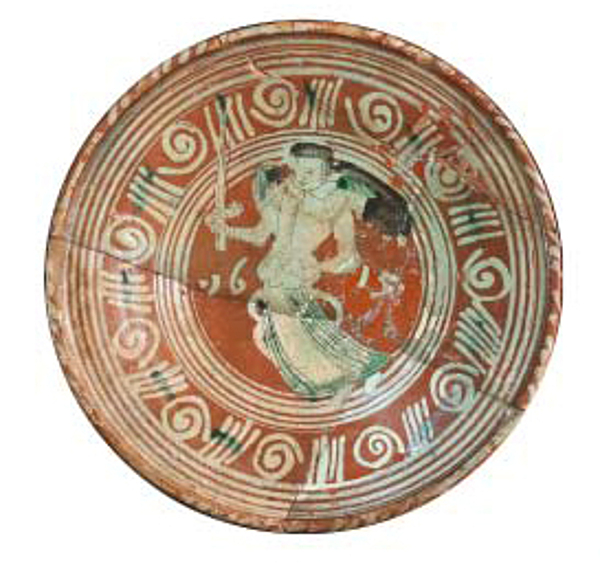 | 5c | decoraties in witte engobe en slibkrastechniek; aartsengel Michaël met getrokken zwaard op spiegel; concentrische cirkels, krullen en arceringen op vlag, groene accenten |