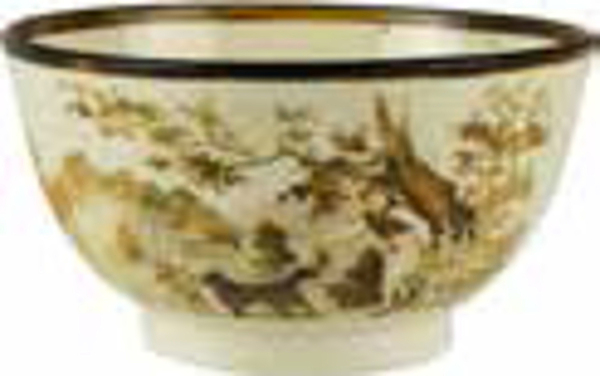| 5c | overglazuur oranje drukdecor: man met hond in landschap; hond draagt mand in de bek met daarin een doek waarop de tekst 'GETROUW' staat polychroom |