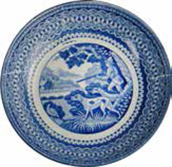 | 5c | onderglazuur blauw drukdecor: jager met twee honden in landschap ('Gun dogs') blauw |