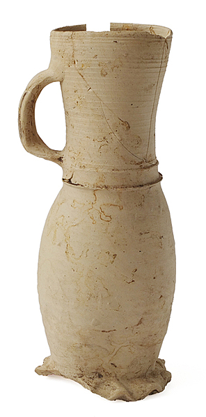 | 4b | lage slanke bekervormige kan met kraag op halsaanzet en rechte rand, op standring |