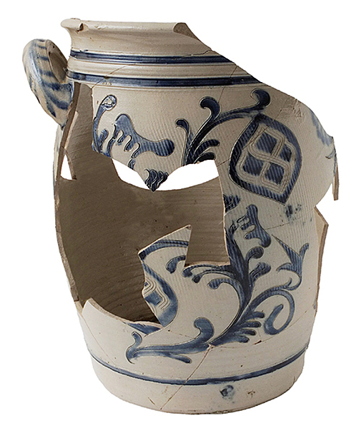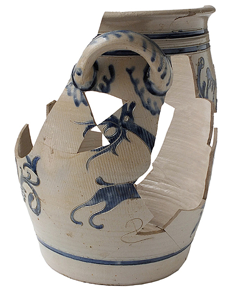 | 5c | blauwe verf, ingekerfd decor met bloemranken en springend hert blauw |