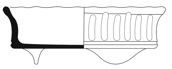 | 4b | lage, komvormige bloempot met uitgebogen gegolfde rand en knorrenversiering, lobvoeten |