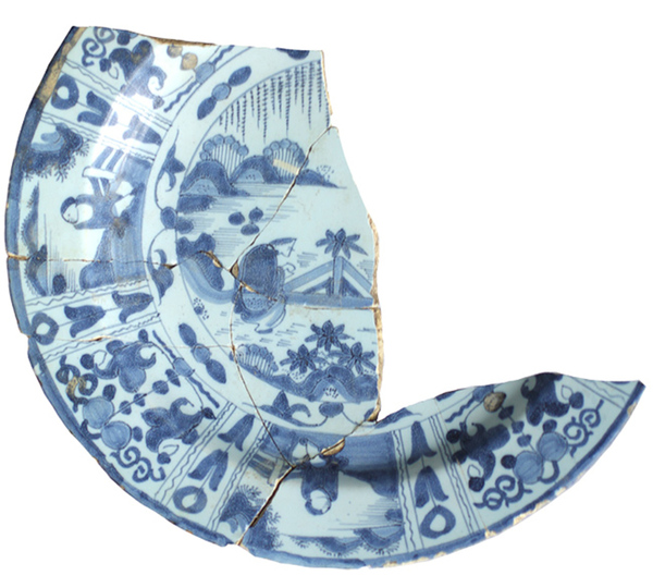 | 5c decoratie | blauwe beschildering, decor ontleend aan laat kraak- / overgangsporselein blauw |