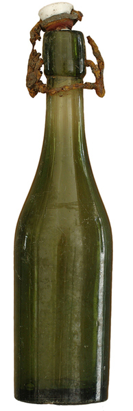 | 4b | slanke cilindrische bierfles met lange hals, afgeronde schouder, lip tonvormig verdikt met twee deukjes voor beugelsluiting, vormgeblazen, opgebolde bodem |