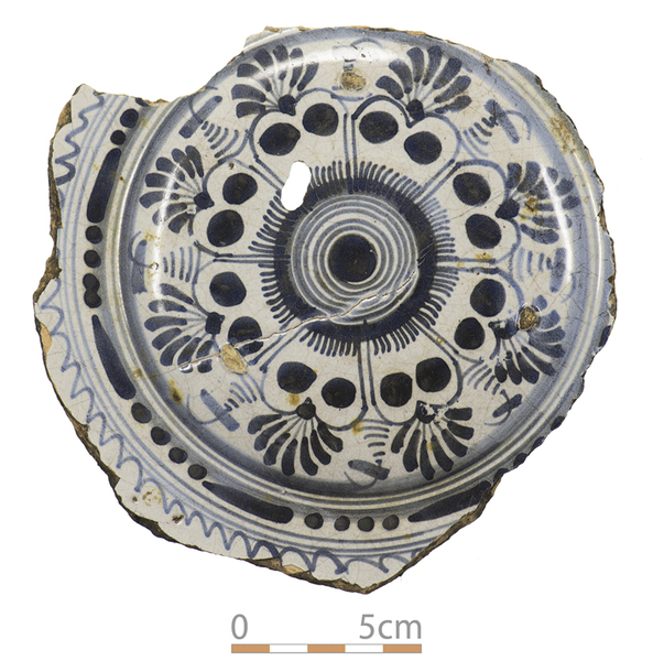| 5c decoratie | bovenzijde blauw beschilderd: gestileerde bloem als hoofdmotief |
