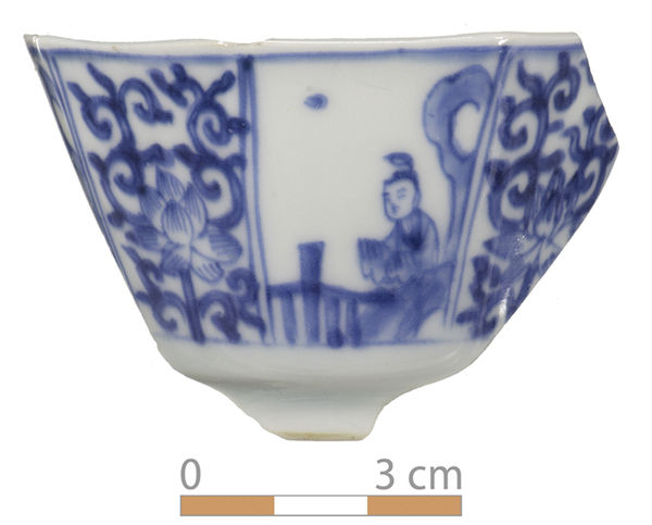 | 5c | blauw beschilderd: inwendig gekruist randmotief, uitwendig panelen met figuur in tuin en bloemmotief |