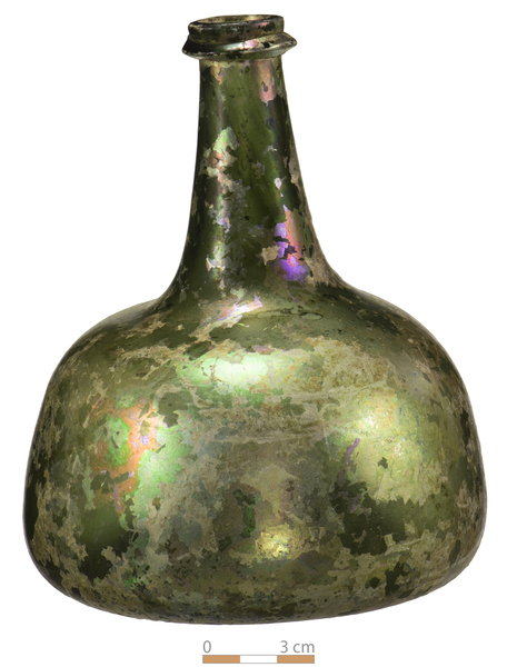 | 4b | bolvormige wijnfles met licht conische buik, grootste breedte aan de basis, opgestoken bodem met pontilmerk |