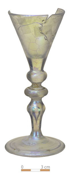| 4b | klok- of trechtervormig kelkglas met dikwandige bodem, holle of (deels) massieve stam met drie of vier geledingen, met balusterstam, met luchtbel, voet (ook met gewelfde voet) met pontilmerk |