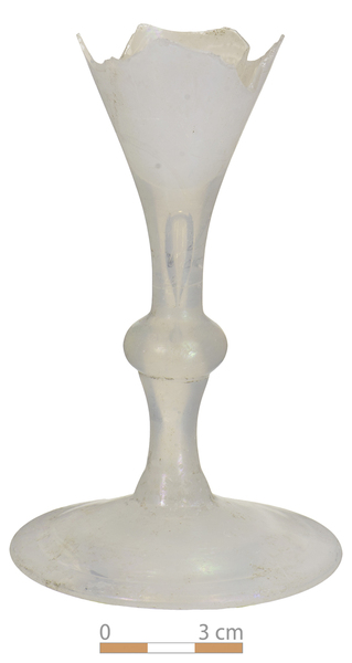 | 4b | conisch kelkglas met afgeronde dikwandige bodem, massieve balusterstam, ook met luchtbel, ook met ribben-relëf, schijfvormige voet met pontilmerk |