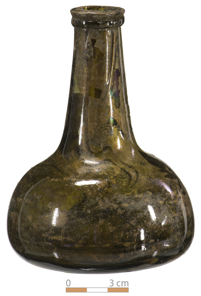 | 4b | bolvormige wijnfles met lange conische hals en uitgezakte buik met grootste breedte aan de basis, conisch opgestoken bodem met pontilmerk |