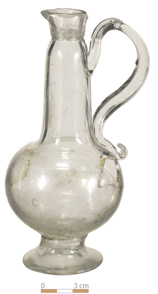 | 4b | druppelvormige kan met korte hals met schenklip en oor, verticaal ribbenpatroon, op standvoet of standring met pontilmerk |