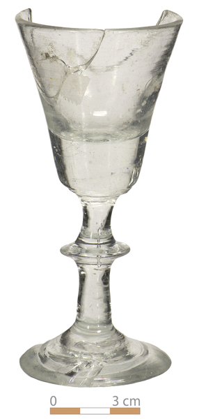 | 4b | trechtervormig, komvormig of cilindrisch kelkglas, ook met uitstaande lip, massieve stam met knoop, dikwandige schijfvormige voet |