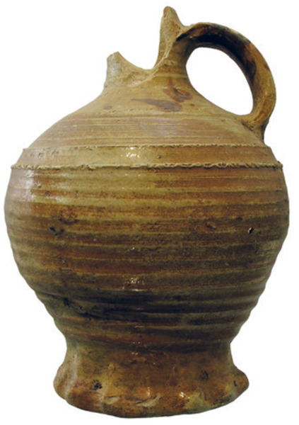 | 4b | bolle kan met afgeronde buikknik, schouder overgaand in hals, ribbels op schouder en hals, kraagrand, standring |