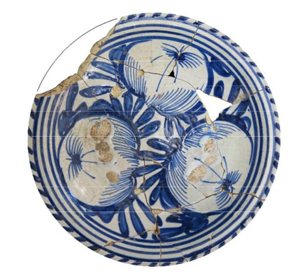 | 5c decoratie | kabelrand, op spiegel: drie granaatappels en concentrische cirkels inwendig: blauw |