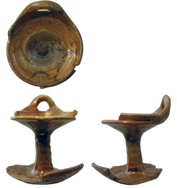 | 4b | olielamp met twee schalen en stam, een worstoor, lekschaal afgeplat, geknikte rand |