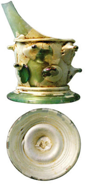 | 4b | roemer met conische cuppa, draad op de overgang naar de schacht en twee of meer verspringende horizontale rijen puntnoppen, opgestoken bodem met pontilmerk, gewonden draadvoet |