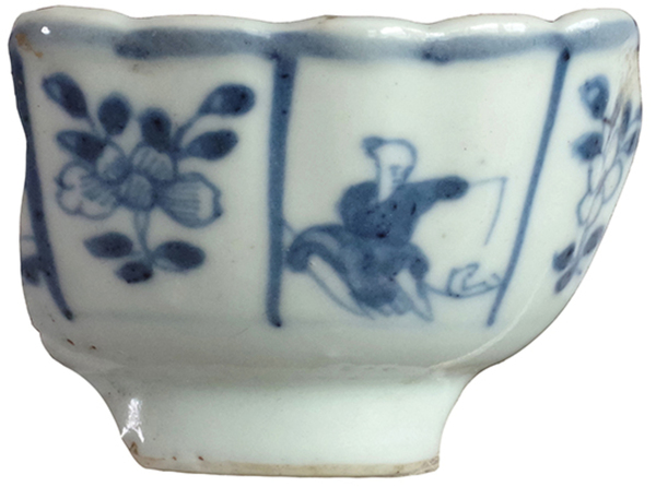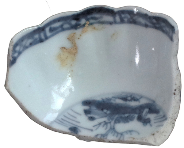 | 5c decoratie | blauwe beschildering: afwisselend zotjes en floraal motief onderglazuur blauw |