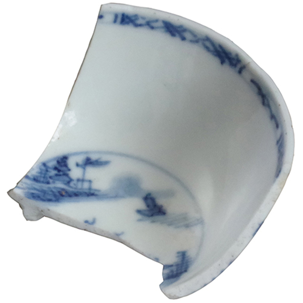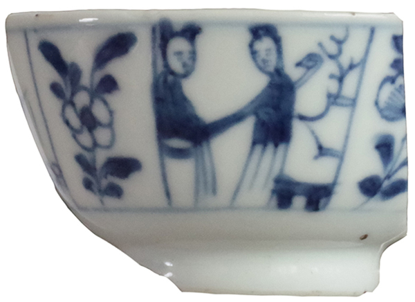 | 5c decoratie | blauwe beschildering: afwisselend lange lijzen en floraal motief onderglazuur blauw |