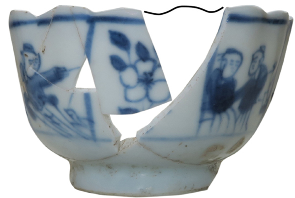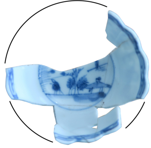 | 5c decoratie | blauwe beschildering: afwisselend zotjes en floraal motief onderglazuur blauw |