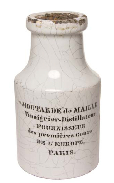 | 5d | tekst: MOUTARDE DE MAILLE VINAIGRE-DISTILLATEUR FOURNISSEUR DES PREMIERES COURS DE L'EUROPE, PARIS; met kurk mosterd |