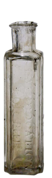 | 4b | vierzijdige medicijnfles met concave hoeken, cilindrische hals, contactvorm met naden, ook met tekst in reliëf, standvlak |