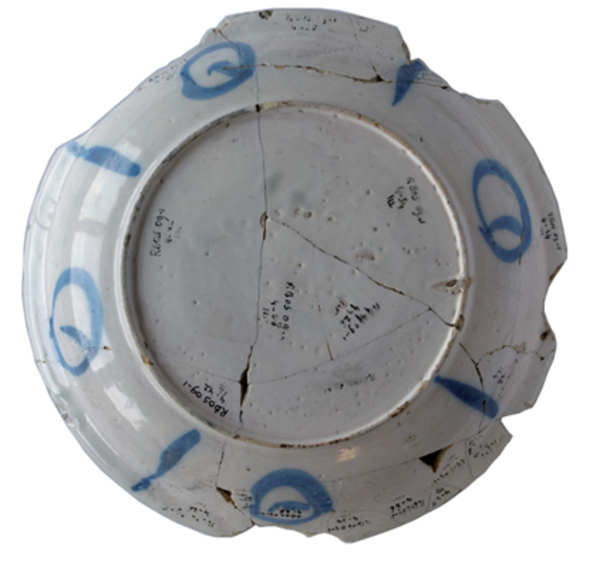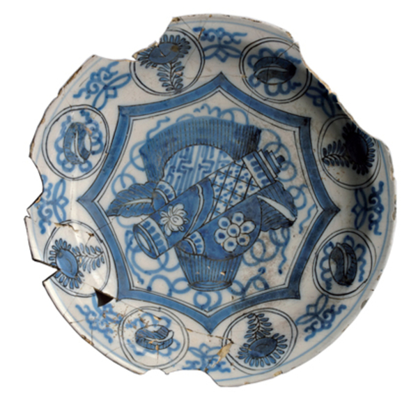 | 5c | spiegel: koker (schrijfgerei) met mand en 2 potten; op vlag: bloemen en symbolen in ovalen. Uitwendig (op vlag) afwisselend viermaal strepen en cirkels; imitatie Chinees blauw |