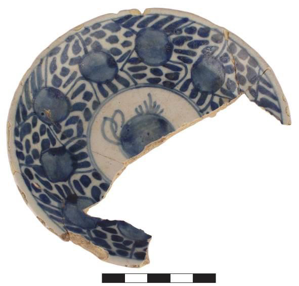 | 5c decoratie | inwendig: patroon van lijnen, stippen en perziken; middenin concentrische cirkel met een vrucht (perzik?) blauw |