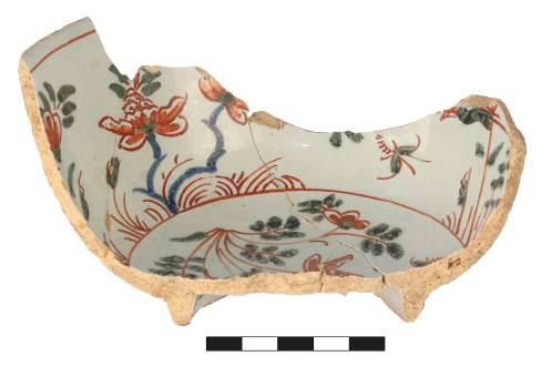 | 5c decoratie | inwendig: botanische voorstelling met insecten in oranje, kobaltblauw en groen; uitwendig egaal bruin/paars polychroom |