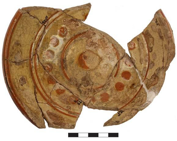 | 5c decoratie | inwendig: slibkrasversiering van concentrische cirkels en stippen van rode slib |