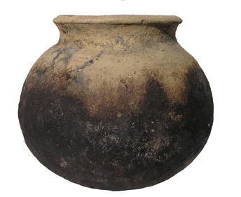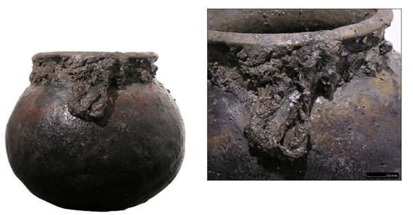 | 5d diversen | beroet, tijdens het opgraven bevond zich rond de hals van de pot het restant van een touw |