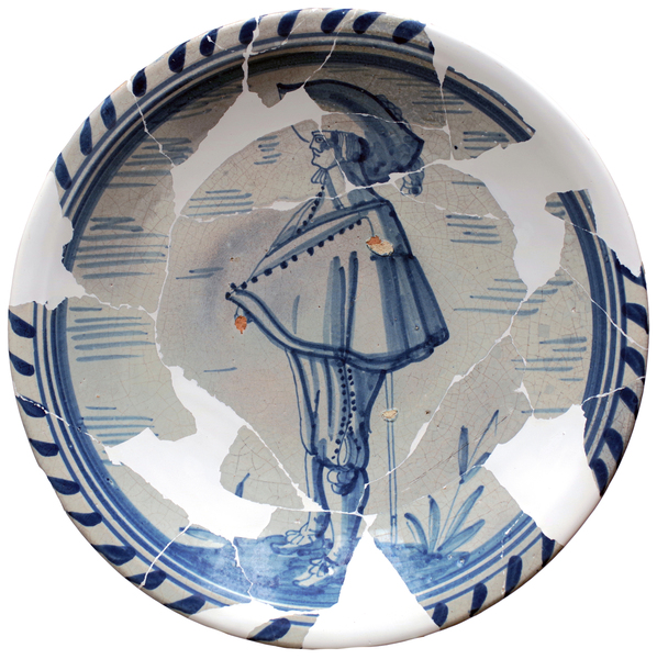 | 5c decoratie | kobaltblauwe beschildering: rijk geklede man met breedgerande hoed ten voeten uit geschilderd inwendig: blauw |