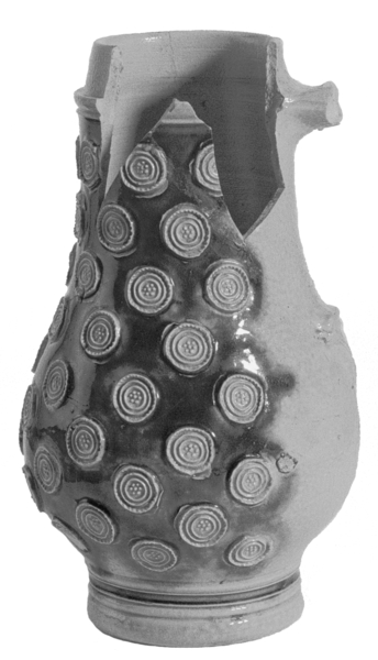 | 4b | rondbuikige drinkkan met zeer hoge wijde hals en ribbel, op standvoet |