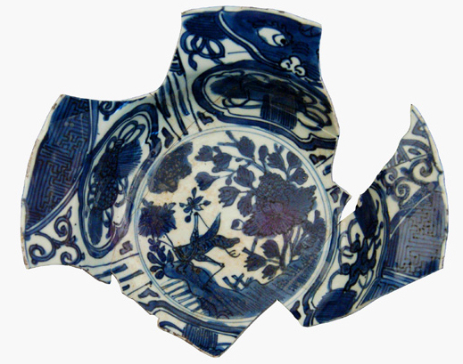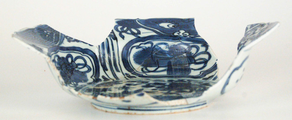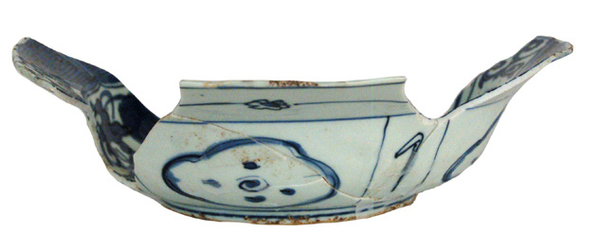 | 5c decoratie | op plat: krekel op rots, op wand: cartouches met Chinese symbolen en op vlag: karper- of monsterkoppen beschildering in onderglazuur blauw |