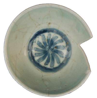 | 5c | op plat: bloemrozet, op buitenwand: perziken beschildering in onderglazuur blauw |