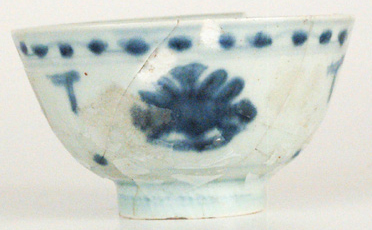 | 5c decoratie | op plat: bloemrozet, op buitenwand: perziken beschildering in onderglazuur blauw |
