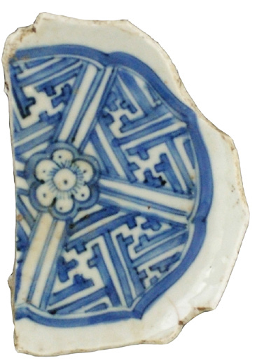 | 5c decoratie | op plat: ornamentaal decor, op rand: geheel wit (reliëfdecor in wand) beschildering in onderglazuur blauw |