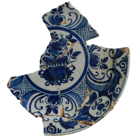 | 5c decoratie | op vlak: bloempot, op wand/rand: rasterpatroon en cartouches met floraal motief blauwe beschildering |
