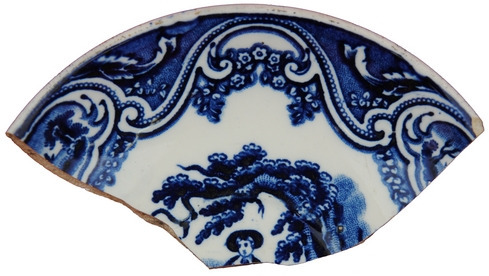 | 5c | inwendig blauw drukdecor: florale decoratie in golvende kaders op wand, figuur met hoed en boom op spiegel blauw |