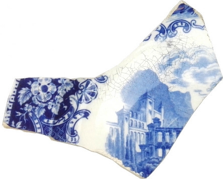 | 5c | inwendig blauw drukdecor: geometrische en florale decoratie op vlag; landschap met lucht en gebouw met torens en bruggen op spiegel blauw |