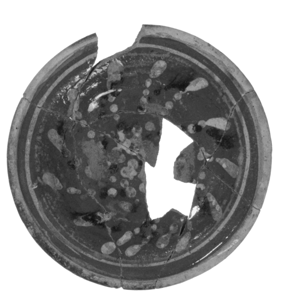 | 5c decoratie | inwendig: onderglazuur slib; vlag: bruine en witte stippen, gespiraliseerd |