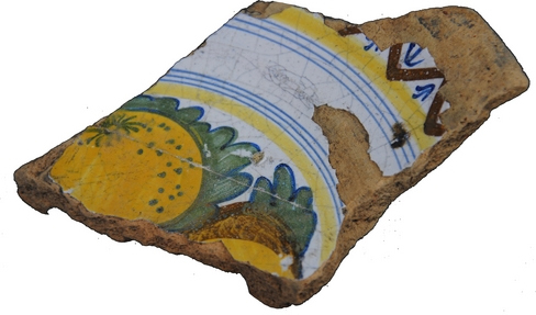 | 5c decoratie | bovenzijde polychrome decoratie: granaatappels op spiegel; geometrische motieven op vlag inwendig: polychroom |