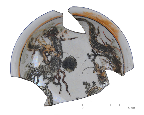 | 5c | inwendig polychrome beschildering: oranje band onder rand; draken op spiegel polychroom |