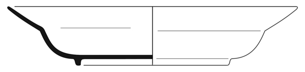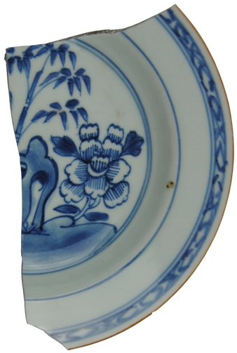 | 5c | bruine streep op rand; inwendig blauwe decoratie: geometrisch bandje op vlag; landschap met bloem en bamboe op spiegel onderglazuur blauw, uitwendig bruin |