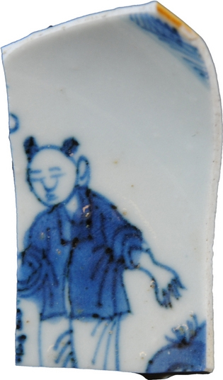 | 5c | bruine streep op rand; inwendig blauwe decoratie: geometrisch bandje onder rand en landschap met Aziatisch figuur onderglazuur blauw |