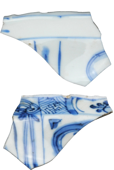| 5c | dubbelzijdig blauwe decoratie in vlakverdeling: inwendig geometrische en florale motieven; uitwendig strepen en cirkels onderglazuur blauw |