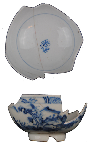 | 5c | blauwe decoratie: uitwendig: geometrisch bandje onder rand, landschap met bergen, bomen en huis op wand; inwendig: streep onder rand en om spiegel; bloem op spiegel onderglazuur blauw |