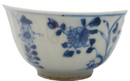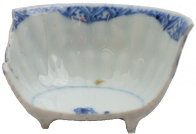 | 5c | dubbelzijdige reliëfwand; dubbelzijdig blauw decoratie: inwendig: golvende geometrische band onder rand en bloemetje op spiegel; uitwendig florale voorstelling met insect onderglazuur blauw |
